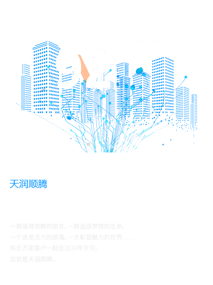 一幫值得信賴的朋友,一群追逐夢想的生命, 一個(gè)迸發(fā)活力的部落,一方彰顯魅力的世界…… 和近萬家客戶一起走過10年歲月, 這就是天潤順騰。